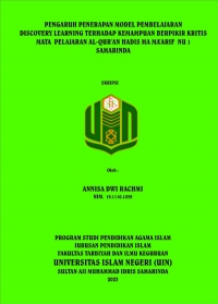 XMLAnnisa Dwi Rachmi. 1911101039. “Pengaruh Penerapan Model Pembelajaran Discovery Learning terhadap Kemampuan Berpikir Kritis Mata Pelajaran Al-Qur’an Hadis MA Ma’arif NU 1 Samarinda”. Progam Studi Pendidikan Agama Islam. Fakultas Tarbiyah dan Ilmu Keguruan Universitas Islam Negeri Aji Muhammad Idris (UINSI) Samarinda. Penelitian ini dibimbing oleh ibu Lismina, S.Ag, M.Pd.I selaku pembimbing I dan Ibu Yunita Noor Azizah, M.Pd.I selaku pembimbing II.