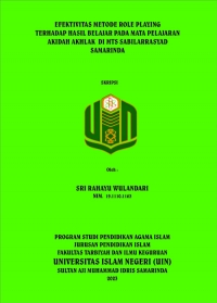 XMLSri Rahayu Wulandari, 2023. Efektivitas Metode Role Playing Terhadap Hasil Belajar Siswa Pada Mata Pelajaran Akidah Akhlak di MTs Sabilarrasyad Samarinda, Skripsi, Program Studi Pendidikan Agama Islam, Fakultas Tarbiyah dan Ilmu Keguruan, Universitas Islam Negeri Sultan Aji Muhammad Idris (UINSI) Samarinda. Dr. Siti Julaiha, M.Pd Sebagai Pembimbing I, Dr. Habib Anwar Al-Anshori, M.Pd Sebagai Pembimbing II. Latar belakang pada penelitian ini menemukan permasalahan yang ada pada hasil belajar Akidah Akhlak pada siswa kelas VIII MTs Sabilarrasyad Samarinda yang minimnya metode yang pada umumnya guru banyak menggunakan metode ceramah dan akhirnya menambahkan metode baru yang sesuai dengan materi yang diajarkan dan peneliti ingin mengetahui apakah efektif atau tidaknya metode role playing terhadap hasil belajar pada mata pelajaran Akidah Akhlak kepada siswa kelas VIII di MTs Sabilarrasyad Samarinda. Penelitian ini merupakan jenis penelitian pendekatan jenis one group pre-test post test design. Populasi dalam penelitian ini adalah seluruh siswa kelas VIII dan sampelnya adalah siswa kelas VIII B yang berjumlah 30 Siswa. Pada penelitian ini variabel bebasnya adalah role playing sedangkan variabel terikatnya pada hasil belajar siswa. Kelas VIII B ini di gunakan sebagai sampel dimana setengah jumlah siswa mereka menggunakan metode role playing untuk bermain peran sedangkan sisanya diperintahkan untuk memperhatikan temannya yang sedang bermain peran mereka tidak ikut serta mereka hanya belajar menggunakan metode ceramah agar bisa mendapatkan perbedaan antara yang menggunakan langsung metode role playing dan tidak menggunakan role playing. Instrumen yang digunakan dalam penelitian ini yaitu berupa tes hasil belajar, lembar observasi dan dokumentasi. Teknik analisis data untuk menganalisa data yang diperoleh dari hasil penelitian yaitu menggunakan analisis statistik deskriptif dan inferensial jadi data yang berupa nilai pre-test dan nilai post-test dibandingkan. Data eksperimen ada beberapa langkah yaitu uji validitas instrumen, uji realibilitas instrumen dan uji prasyarat. Hasil penelitian ini menunjukan bahwa penggunaan pada metode role playing ini efektif dilakukan karena ada peningkatan pada hasil belajar siswa dan semangat siswa, Nilai hasil belajar siswa pada saat pre-test masih dalam kategori rendah. Tes pilihan ganda (Pre-test) menunjukan hasil belajar siswa sebelum diterapkan berada pada nilai 48,50 yang di kategorikan masih rendah dan belum mencapai KKM dan pada saat dilakukan nya perlakuan lalu diberikan tes post-tes berada pada kategori tinggi, test pilihan ganda post-test menunjukkan ada peningkatan pada hasil belajar siswa berada pada nilai 88,50 yang termasuk pada kategori tinggi dan sudah mencapai Kkm yang berlaku.
