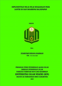 XMLSyarifah Rihana Rahman, 2023, Implementasi Nilai-Nilai Keagamaan pada Santri di MAN Boarding Balikpapan. Skripsi, Program Studi Pendidikan Agama Islam Fakultas Tarbiyah dan Ilmu Keguruan Universitas Islam Negeri Sultan Aji Muhammad Idris Samarinda dengan Bapak Drs. H. Ahmad Riyadi, S. S., M. Hum selaku Dosen Pembimbing I dan Ibu Yunita Noor Azizah, M. Pd. I. selaku Dosen Pembimbing II.