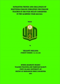 XMLYulianti Muliana, 2024. Navigating Trends and Challenges of Digitizing English Education for English Teacher at SMA Plus Melati Samarinda in Academic Year 2023/2024. Undergraduate Degree. Thesis, Education and Teacher Training Faculty, State Islamic University of Sultan Aji Muhammad Idris Samarinda. Advisor; Mrs. Rostanti Toba, M.Pd is the first advisor, and Mrs. Nadia Sya'ya, M.Pd., M.TESOL is the second advisor. Digitizing education is the process of transitioning from traditional to modern methods, such as from paper to paperless and from books to technology accessible online. This research describes wisely navigating the transformation of English education into a world of technology or digitizing, which includes: era/time, widely discussed trends in the use of technology, challenges, dynamics, and other supporting components. This research aims to (1) explore the extent to which the trends of digitizing English education influence teacher' obligations to teach and the fulfillment of curriculum requirements at SMA Plus Melati Samarinda. (2) to identify and analyze the challenges encountered by English teacher in the process of digitizing English Education at SMA Plus Melati Samarinda, and (3) to investigate a school principal and students perspectives on the utilization of technologies in the teaching-learning process used by an English teacher at SMA Plus Melati Samarinda. This research used a qualitative research method. The approach to conduct this research was a descriptive qualitative design. The data was collected through observations, interviews, and documentation. This research used data collection, data condensation, data display, and conclusion as data analysis techniques. The participants were an English teacher, school principal, and students in SMA Plus Melati Samarinda. The result showed that in the context of digitizing English education, teacher utilize technological trends in the form of hardware, software, and social media in learning. Digital trends are divided into two factors: technology use in education and digital-based learning. In its application, the researcher found challenges influenced by four factors; curriculum, learning methods, support and management, and evaluation. These findings are strengthened by the perspectives of a school principal and students, which indicate similar thoughts about the technology utilization (digital trends) by English teacher and problems (challenges) that arise during the learning process.