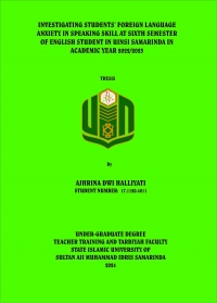 XMLHalliyati, Ajhrina Dwi. 2024. “Investigating Students’ Foreign Language Anxiety in Speaking Skill at Sixth Semester of English Student in UINSI Samarinda in Academic Year 2022/2023”. Undergraduate thesis. English Education Department, Teacher Training and Education Faculty, State Islamic University Sultan Aji Muhammad Idris Samarinda. This research in under the guidance of Mr. Umar Fauzan, M. Pd as the first advisor, and Dra. Sitti Hadijah, M. Pd as the second advisor. Speaking is one of most complicated skill among four English skills. English learners are exceedingly needed to master speaking skill. Although speaking skill is exceedingly important, English learners always found problems during mastering speaking skill. One of the biggest problems is the anxiety in speaking skill. The research objectives of this research are to know the factors of anxiety in speaking skill and to know the solutions of anxiety in speaking skill. This research used the descriptive quantitative research. The instrument of this research was the questionnaire. The kind of questionnaire that used in this research was close-ended question that consist of 60 questions related to the factors and solutions of anxiety in speaking skill. The questions of the questionnaire consisted of Yes and No answer. The data of this research was calculated by frequency calculation. The population of this research was the sixth semester students of English Department in UINSI Samarinda in academic year 2022/2023. The researcher finds and selects 10 factors of anxiety and 5 solutions of anxiety in speaking skill. The first finding is the factors of anxiety in speaking skill. The factors are the incomprehensible input, students’ belief about anxiety, lack of preparation, afraid to make mistake, unconfident to speak English, anxiety when teacher asked to speak up, speaking in front of class, study environment, teacher personality, and unfavorable evaluation. There is another finding which is the solutions of anxiety in speaking skill. The solutions are preparation, relaxation, mindset management, more willing to take risks, and improve speaking skill. Thus, the factor of anxiety that contribute the most in speaking anxiety is lack of preparation and the solution of anxiety that the most effect to overcome the anxiety is mindset management.