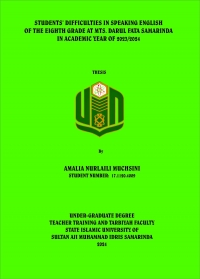 Amalia Nurlaili Muchsini. 2024. “Students’ Difficulties In Speaking English Of The Eighth Grade At MTs. Darul Fata Samarinda In Academic Year 2023/2024”. Thesis, Language Education Department, English Language Study Program, Education and Teacher Training Faculty, State Islamic University Of Sultan Aji Muhammad Idris Samarinda. This research was supervised by Rostanti Toba, M.Pd, as the first advisor, and Anis Komariah, M.Pd as the second advisor. English has become a global language used in different social settings, such as workplaces or educational fields. Therefore, the Ministry of Education has decided to incorporate English as a subject to be taught in the schools to the students. However, in reality, many students struggle to master English, especially speaking, because they face difficulties. The students often stutter or stop talking when they do not know the word in English. They also lack of vocabulary mastery. These problems hinder the students from speaking English fluently. Thus, the researcher conducted a research with several purposes. The first is to discover the difficulties that the students faced in mastering the speaking skills. The second is to find out the strategies that the teacher used to help the students to overcome the difficulties. The data was collected during the in English class. The research used qualitative method. In addition, this research used Interview and observation as instruments. The data was collected through interviews with the students and teacher, and observation in the classroom during the teaching and learning process. Then, the data was analyzed using Miles and Huberman’s steps. There are data condensation, data display, and drawing conclusion/verification. Triangulation was used to validate the data. The results of the research at MTs. Darul Fata Samarinda showed that the students faced difficulties in speaking English. The problems were linguistic problems and non-linguistic problems. The linguistic problems consisted of lack of vocabulary, grammar, and pronunciation. The non-linguistic problems consisted of fear in making mistakes, shyness, anxiety, lack of confidence, and lack of motivation. Meanwhile, the strategies used by the teacher to overcome these difficulties were pairs or group discussions, and repetition and memorization strategies.