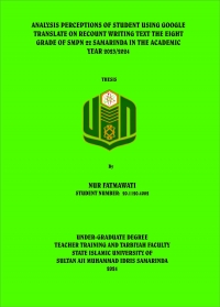 Fatmawati, Nur, 2024. Analysis Perceptions Of Student Using Google Translate On Recount Writing Text The Eight Grade Of SMPN 22 Samarinda In The Academic Year 2023/2024. Mrs. Dina Destari S.S.M.pd as the first supervisor. Mr. Muhammad Azwar Azmi Paramma, M. Pd as the second supervisor. Currently, the utilization of media and instruments as facilities for the acquisition of the English language has progressed, particularly with the advent of technology, which aids in the enhancement and augmentation of the experience of learning English. Various tools for online learning, including Google Translate, enable the provision of assistance to students in the translation of languages from all corners of the world. The research objective is to find how the use of Google Translate in improving students' writing in recount text and find the students perception on google translate to improve their writing skills. The research employed descriptive qualitative research. The instrument it conducted observation, interviews and documentation. The research subject was eight-grade students which conducted two of classes from 8H and 8I class. The study involved 13 students at SMPN 22 Samarinda in Academic year 2023/2024 as participant, it aims the writing of recount text found 4 problems from capitalization, spelling, punctuation and writing structure. The role of google translate provides assistance to students on how to improve and help students in writing. Then the next finding is how the use of Google Translate has received a positive response so that students feel that its use, although it has shortcomings, will still be used according to the students' own needs. Because for students, the use google translate is considered based on the frequency of students using Google Translate, either often or sometimes. ,conditional or none. This is what creates several perceptions from students themselves regarding the use of Google Translate.