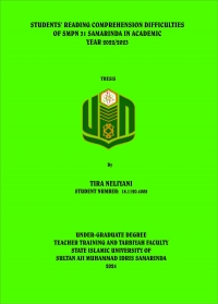 Tira Neliyani. 2023. “Students Reading Comprehension Difficulties Of SMPN 31 Samarinda In Academic Year 2022/2023 Thesis, English Education Department, Teacher Training and Education Faculty, State Islamic University Sultan Aji Muhammad Idris Samarinda. This research is under the guidance of Mrs. Rostanti Toba, M.Pd as the first advisor and Mrs. Nadia Syaya, M.Pd., M. TESOL as the second advisor. Discussion about reading comprehension in Teaching English as Foreign language was interesting. In reality there are various problems faced by students. One of which is an environment that is less supportive discussion about Reading Comprehension Difficulties in Teaching English as Foreign language was interesting. Other problems faced are inappropriate use of smartphones and reading habits that are not trained from an early age. Based on this phenomenon, the researcher said to reveal what is the student's reading comprehension. Difficulties and the solutions to solve these problems. This research used a qualitative descriptive method. The subjects of this research were 5 students at SMPN 31 Samarinda. Data collection was carried out by interview and observation. Then the data will be analyzed using this model interaktif Miles, Huberman, and Saldana uses data validity techniques using data triangulation. Based on the data results, the researcher found that the Reading Students Comprehension Difficulties that students faced are of vocabulary, could not understand techniques in reading comprehension. And that the students' main difficulties were influenced by their weaknesses in mastering various vocabulary. Therefore, students find it difficult to understand reading the text. The possible solution for students is, by providing awareness of vocabulary knowledge to students that can improve their reading comprehension.