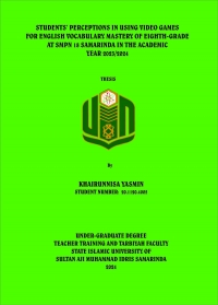 XMLKhairunnisa Yasmin, 2024. “Students’ Perceptions in Using Video Games for English Vocabulary Mastery of Eighth-Grade at SMPN 18 Samarinda in the Academic Year 2023/2024. Thesis, Language Education Department, Tarbiyah and Teacher Training Faculty State Islamic University Sultan Aji Muhammad Idris Samarinda”. This research is under the guidance of Mr. H. Shafa, S.PdI, M.Pd, as the first supervisor, and Mrs. Nadia Sya’ya, M.Pd, M.TESOL, as the second supervisor. English is essential for communication worldwide but learning vocabulary can be challenging for non-native English-speaking students. Video games can be an attractive alternative to learning English, as they involve mastering vocabulary in various scenarios and circumstances. Students can develop positive or negative perceptions of video games they use for their vocabulary mastery. Understanding students' perceptions is crucial for teachers, as it helps guide the learning process effectively, keeping students engaged and preventing boredom in their education. This research aimed to investigate the students' perceptions in using video games for English vocabulary mastery and find out whether video games benefit students master English vocabulary. This research employed quantitative research with descriptive analysis. The participants were all eighth-grade students at SMPN 18 Samarinda, with a total of 126 students. The sampling technique used was saturated sampling. The data collection technique used the distribution of 25-question questionnaires via Google form, and the data analysis technique used descriptive frequency statistics to analyze student perceptions. The final calculation of data analysis in the statements concerning students’ perceptions in using video games to master English vocabulary resulted in a percentage of 74,86%, and the statements concerning whether video games benefited students in mastering English vocabulary resulted in a percentage of 73,32% showed that students positively perceive video games as a means of mastering English vocabulary. Students feel motivated to master the language with in-game tasks, goals, competitions, events, and interactions. The appealing features of sound clips, pictures, and graphics help students understand and master English vocabulary effectively.