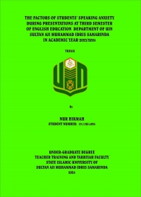 Nur Hikmah. 2024. “The Factors of Students’ Speaking Anxiety during Presentations at Third Semester of English Education and Department of UIN Sultan Aji Muhammad Idris Samarinda in Academic Year 2023/2024.” Thesis, English Education Department, Teacher Training and Tarbiyah Faculty, State Islamic University Sultan Aji Muhammad Idris Samarinda. This research was supervised by Rostanti Toba, M.Pd as the first advisor and Nadia Sya’ya, M.Pd., M. TESOL as the second advisor. Speaking anxiety is one of the majority problems of students when they have to give presentations in front of the class. Based on pre-observation, the researcher found that some students admitted that they experienced speaking anxiety during presentations due to a lack of confidence and were nervous during presentations in front of the class. The objective of this research was to analyze the factors of students’ speaking anxiety during presentation at third semester of English Education Department of UIN Sultan Aji Muhammad Idris Samarinda in Academic Year 2023/2024. This research used a descriptive qualitative research method as a research design. The subjects of this research were third-semester students in TBI 2 class. The data were collected through observation and interview. The researcher used three steps, namely data condensation, data display, and drawing conclusion and verification. Triangulation method was used as data validation of the research. The results of this research showed that there were three factors of students’ speaking anxiety during presentations at third semester of English Education Department of UIN Sultan Aji Muhammad Idris Samarinda. The first factor was communication apprehension: students felt anxious due to nervousness, lack of confidence, shyness, and lack of vocabulary. The second factor was test anxiety: students felt anxious due the fear of failure and lack of preparation. The third factor was the fear of negative evaluation: students felt anxious due the fear of being laughed at and fear of being judged. Based on the result, the researcher concluded that communication apprehension, test anxiety, fear of negative evaluation were the factors causing students’ speaking anxiety during presentation at third semester of English Education Department of UIN Sultan Aji Muhammad Idris Samarinda.