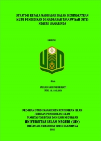 XMLWulan Sari Nurhayati, 2022 “Strategi Kepala Madrasah Dalam Meningkatkan Mutu Pendidikan di Madrasah Tsanawiyah (MTs) Negeri Samarinda”. Skripsi, Program Studi Manajemen Pendidikan Islam, Fakultas Tarbiyah dan Ilmu Keguruan, Universitas Islam Negeri (UIN) Sultan Aji Muhammad Idris Samarinda. Penelitian ini dibimbing oleh pembimbing I Dr.Suratman, M.Pd dan Pembimbing II Anggie Nadia Dinihari, M.Pd.