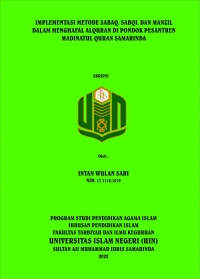 XMLIntan Wulan Sari, 2022. “Implementasi Metode Sabaq, Sabqi, dan Manzil dalam Menghafal Alquran di Pondok Pesantren Madinatul Quran Samarinda”. Skripsi, Prodi Pendidikan Agama Islam Fakultas Tarbiyah dan Ilmu Keguruan Universitas Islam Negeri (UIN) Sultan Aji Muhammad Idris Samarinda. Penilitian ini dibimbing oleh Bapak Muhammad Iwan Abdi, M.SI selaku pembimbing I dan Bapak Dr. Agus Setiawan, M.Pd.I selaku pembimbing II.
