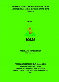 Latar belakang penelitian ini berawal dari Observasi penulis di MTs Al Jihad Samboja dan penulis melihat perilaku siswa-siswi disana sangat terpuji seperti memberi salam dan hormat kepada guru saat bertemu, menebar senyum ramah terhadap sesama, dan bertutur kata yang baik. Oleh karena itu peneliti peneliti tertarik untuk meneliti implementasi pendidikan karakter yang diterapkan di MTs Al Jihad Samboja. Dengan demikian penulis dapat mengetahui dengan jelas penerapan pendidikan karakter di sekolah tersebut, yang mampu menciptakan karakter yang baik terhadap siswa-siswi MTs Al Jihad Samboja dalam meningkatkan moral siswa. Sebab itu permasalahan dirumuskan sebagai berikut: (1) Bagaimana implementasi pendidikan karakter dalam meningkatkan moral siswa di MTs Al Jihad Samboja? (2) Apa saja faktor pendukung dan penghambat implementasi pendidikan karakter dalam meningkatkan moral siswa di MTs Al Jihad Samboja?